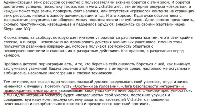 СОЦСЕТЬ "ВКОНТАКТЕ" - ОЧАГ ПОПУЛЯРИЗАЦИИ ПЕДОФИЛИИ и прочих мерзостей (материал не для слабонервных!)Мы не рекомендовали бы к ознакомлению этот материал для лиц с нестабильной психикой, беременным женщинам, лицам преклонного возраста, а также лицам не достигшим совершеннолетия. «Охотники за головами», пожалуй одно из самых титулованных общественных объединений по борьбе с педофилией и по противодействию распространения «детской порнографии» в сети Интернет. На сегодняшний день у нас за спиной два крупных реализованных проекта: социальная сеть «Мой Мир» и одна из крупнейших систем видеочатов «Вичаттер». Немного о былых заслугах исключительно для того, чтобы у адресатов этого обращения, присутствовало объективное представление об личности заявителей. Завтра мы пригласим ознакомиться с данным материалом сотни и сотни публичных людей: актеров, певцов, журналистов, политиков и у каждого из них возникнет вопрос, в силу недостаточной информационной осведомленности о том, кто такие «Охотники за головами». Как пример нашей работы — в 2011 году мы остановили тотальное растление детей на ресурсе видеочатов «Вичаттер», где с «молчаливого согласия» администрации ресурса тысячи «сетевых извращенцев» подкупали детей в возрасте десяти-двенадцати лет (в среднем), понуждая детей обнажаться перед веб-камерами и демонстрировать гениталии. К вашему вниманию цензурный снимок с «Вичаттера». По понятным причинам даже заретушированные снимки с обнаженными детьми, на данной информационной площадке, мы выкладывать не можем. К вашему вниманию один из задокументированных фактов растления детей на «Вичаттере». Примерно через полчаса одна из этих девочек начнет демонстрировать свои гениталии под град аплодисментов со стороны «сетевых педофилов» (все материалы существуют в оригинальных версиях). ![]() Детей подкупали за виртуальную валюту и те охотно раздевались, демонстрируя в откровенной форме свои гениталии. Примечательно, что такие трансляции не носили приватный характер и были в открытом доступе. В итоге все фигуранты (заинтересованные стороны) получили желаемое: дети заработок (пускай и сомнительный), педофилы получили голых детей, а администрация ресурса подсчитывала растущие доходы. Остановить эту вакханалию удалось лишь путем разжигания скандала в СМИ - https://www.mk.ru/social/article/2011/06/09/596349-ohot-na-pedofilov.html К вашему вниманию пресс-релиз, опубликованный владельцами «Вичаттера» в ответ на разгоревшийся вокруг их ресурса скандал. ![]() Все верно, руководство Вичаттера не ошиблось и действительно поле безопасности сети Интернет для детей, обеспечивают три основных коллектива и каждый находится в своей рабочей нише: "Лига Безопасного Интернета (общественное объединение, работающее под эгидой правительства и курируемое министром Щеголевым), МВД (уполномоченная государственная структура по обеспечению правопорядка) и мы, "Охотники за головами" (неформальное объединение пользователей, начинающее работать там, где первые две структуры бессильны). Мы позволили себе озвучить пример своей работы, исключительно для того, чтобы проиллюстрировать цели и задачи текущей акции. Сегодня, мы призываем на помощь огромное количество людей и организаций в борьбе с крупнейшим очагом распространения «детской порнографии» и эпицентром нравственного разложени