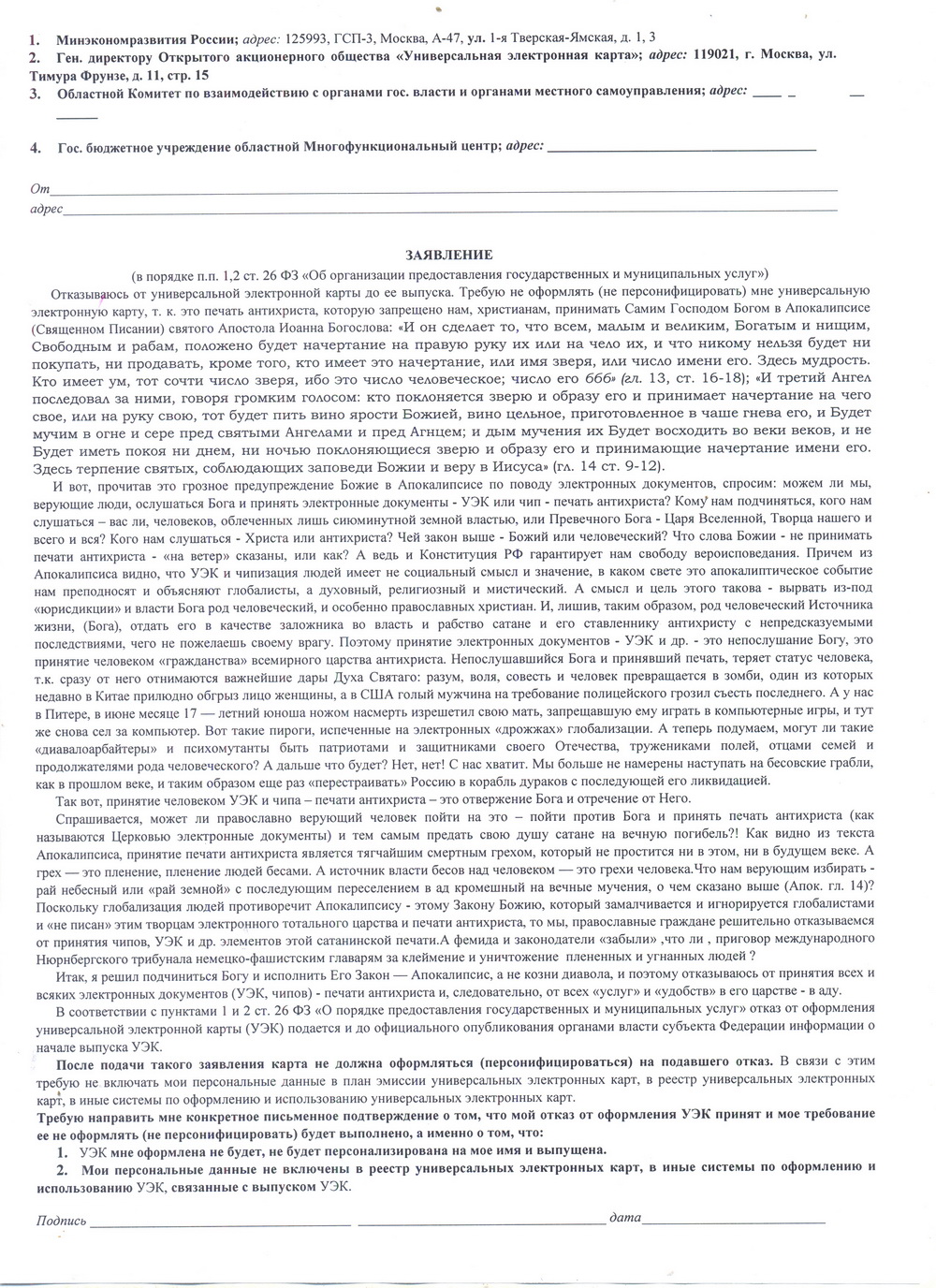 Предлагаем вам форму отказа от Универсальной электронной карты, составленную и благословленную при непосредственном участии духоносных отцов. Этот отказ примечателен тем, что в нем выдвигается требование не только не выдавать УЭК, а даже не выпускать её, т.е. не включать в план эмиссии.