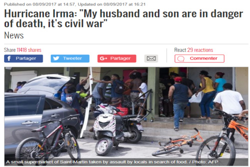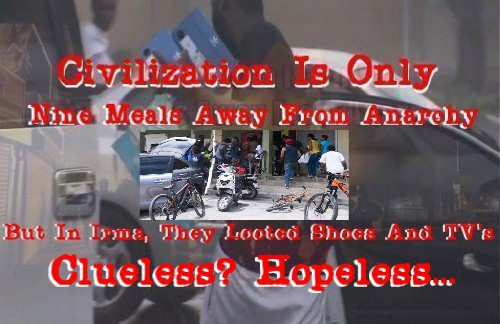 быть готовым к реальной ситуации выживания.Почти половина штата Флорида сейчас находится в темноте, как сообщает "Фокс Ньюс” и нужно провести огромную работу, чтобы все восстановить. Во многих областях сейчас мы наблюдаем хаос и мародерство из-за отсутствия власти, и вероятно, мы продолжим видеть "провалы”, как было в Хьюстоне. Как Стив Куэйл уже давно нас предупреждал: нет еды = нет мира = насилие = смерть, он также предупреждает нас, что мы скоро увидим самый большой дефицит продовольствия в Америке, в отличие от всего, что мы видели в истории. Стив попросил нас, чтобы мы донесли эту важную информацию до читателей АNP, что позволит объяснить тот ужас, который приближается к Америке и даже FEMA не сможет помочь, к тому же и деньги заканчиваются. Согласно последним сообщениям от La Depeche, на острове Saint Martin в настоящее время существует опасность гражданской войны после урагана Ирма. Так как остров полностью опустошен, нет электричества, нет еды и воды. Банды заполонили остров, пристают к жителям и предупреждают белых, чтобы те покинули остров. Как мы видим, худшее из худших начинает проявляется у некоторых людей в то время, когда люди должны объединиться, чтобы помогать друг другу. И как мы читаем в этом материале, на острове произошло больше смертей, чем сообщается в СМИ и мы слышим в заявлении одной из жительниц Saint Martin, кто живет здесь уже 25 лет, что там начинается паника . Изабель, родившаяся в Тулузе, живет на острове Saint Martin уже 25 лет. Это врач, который в настоящее время находится в отпуске в Тулузе, обычно, благодаря своей работе, имеет нервы из стали. Но со вчерашнего дня она в полной панике и призывает к помощи, потому что она боится за жизнь своего мужа и сына, которые находятся на острове, который был разорен ураганом Ирма. "Моему мужу и моему сыну грозит опасность быть убитыми, как и большей части населения. Там идет гражданская война. Мы начали слышать некоторые разговоры в средствах массовой информации о мародерах, которые грабили магазины после урагана, но это все мелочь и очень далеко от реальности. Банды головорезов ограбили таможню, которая была сильно повреждена, и украли запасы оружия, которые были там. С четверга вечером они двигались взад и вперед по островам, одевая маски и капюшоны, атакуя дома, которые все еще стояли там, где укрылись жители” , – говорит она со слезами на глазах. "Вчера вечером я говорила с ними по телефону. Они парализованы страхом. Это все происходит вокруг нашего дома, где они забаррикадировались с шестью друзьями, которые находятся у нас дома, потому что их вилла была разрушена”, – продолжает она. "Они не могут выйти. Говорят, что нападают банды из десятков людей, которые готовы стрелять, чтобы получить еду или деньги”. Ее утверждения подтверждены свидетельствами других жителей острова, которые рассказывают в социальных сетях о многочисленных бандах, которые вламываются в дома, говоря «Белые вон». Сейчас мы подробно рассмотрим всю хрупкую цепочку "закона и порядка”, особенно с весом 325 миллионов человек на своей спине. На примере последствий сильного погодного катаклизма, который прошел на Карибских островах и во Флориде, и который показывает, как быстро все может перейти в жестокую форму. Ключевым моментом здесь