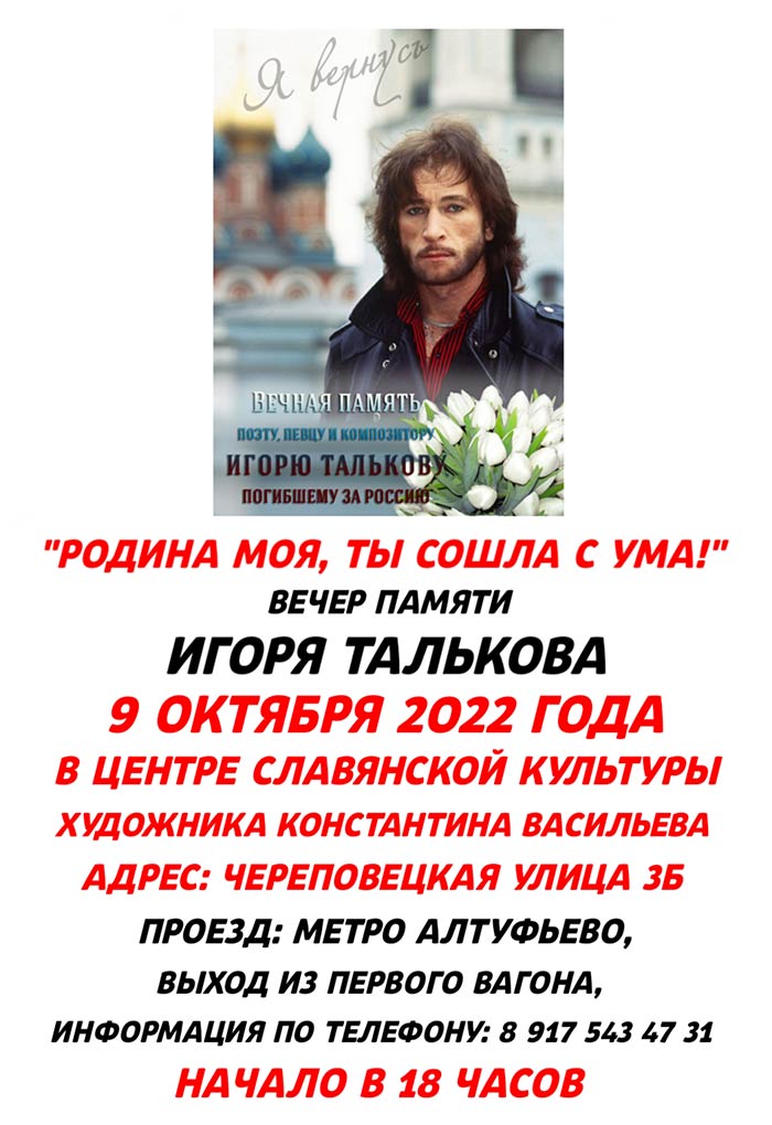 ОБЪЯВЛЕНИЕ. Вечер памяти русского поэта, певца, композитора Игоря Талькова![]() Дорогие друзья! 9 октября сего, 2022 года, в Москве, в музее художника Константина Васильева, состоится вечер памяти русского поэта, певца, композитора Игоря Талькова. Уже многие годы творческое объединение "Заря Близка!" традиционно проводит осенью вечера памяти нашего незабвенного героя настоящей России, подло убитого врагами Отечества за горькую правду о всë продолжающейся Российской Катастрофе. Творчество русского самородка, трибуна и глашатая русского пробуждения, Игоря Талькова – это сильное духовное оружие в битве с ложью, поработившей нашу землю. Его песни и сегодня актуальны и злободневны, востребованы живыми сердцами! На вечере памяти выступят поэты, музыканты, авторы-исполнители: Алексей Дорогов, Сергей Шкарпета, Николай Боголюбов, Сергей Рассказов, Георгий Боровиков, Ольга Татищева-Бобкова, Дарья Алексеевская, Нина Аверина и другие. Гостям вечера будет предложен широкий выбор редкой литературы по истории Белой борьбы, не фальшивого Русского Православия.