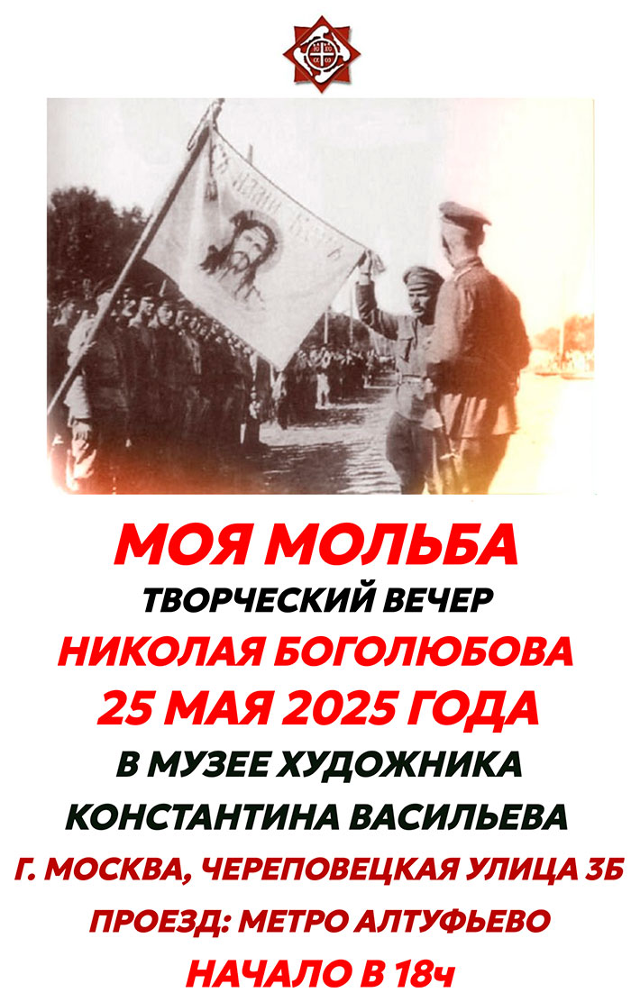 ОБЪЯВЛЕНИЕ. "МОЛЬБА". Москва. Приглашаем на творческий вечер. 25 мая 2025г.![]() ХРИСТОС ВОСКРЕСЕ! Николай Боголюбов – Поэт Русских Катакомб. В его стихах жестокие реалии сегодняшнего времени открываются через призму духовных ценностей Православия, когда цепь исторических событий неумолимо приближает цивилизацию к Апокалипсису, а главная цель человека – спасти свою безсмертную душу. Но не спасти своей души, предав Бога и вечные ценности – Добро, Правду, Любовь, которые ныне необходимо отстаивать подчас ценою временной жизни. Стихи Николая Боголюбова являют нам Православие Воинствующее – Православие бойцов-защитников неотмiрной, Христовой Руси, Православие пророков-бунтарей, Христа ради юродивых. Поэт убеждëн: истинное Христианство не приемлет примирения с сатанизмом, унижающим, порабощающим, убивающим народы, оно презирает подобострастие перед "золотым тельцом" и тëмной силой лжи. "Наш мiр не спасут слепые интеллектуалы или скучающие учëные. Его спасут поэты и борцы – те, кто выкованы, как " волшебный меч", как духовное оружие, пред коим бледнеют монстры и тираны". ( Доминик Веннер). Такой "волшебный меч" являет нам эта поэзия, поэзия своевременная и жгуче актуальная, когда "дети дьявола" поистине бешенными темпами достраивают своë богохульное "царство" на земле. Поэзия Боголюбова не искусство, не самоцель, еë задача нести идеологический заряд, формировать у читателей определëнное мiровосприятие, выковать из них духовный "Меч-кладенец" – грозное мистическое оружие поэтов и борцов Последней Руси... Марина Струкова. ...Русский поэт вышел к своему народу во главе Ордена крестоносных стихов, – но движение поэта к народу предполагает и движение самого народа к духовному и героическому началу, возвещаемому поэтом. "Народ, в котором пример силы духа и величия не пробуждает больше ни величия, ни силы духа, не имеет ничего общего с теми, кои ещё остались людьми, он потерял все свои права". ( М. Коммерель). Дай Бог нам, последним Русским, "остаться людьми", не "потерять свои права" и не уподобиться "безвольному трупу", дабы Верховный Промысл и Русская Поэзия не "разочаровались" в нас... о. Роман Бычков. РАССВЕТ Газует ночь на перекрёстках... Пока могильник гадко спит, Рассвет мужает, как подросток, Тревожа пламенем гранит! Он фанатичен! В жутких узах Жжëт изнутри дремучий лес... Он ненавидит биомусор Всей белой яростью Небес! Земною косностью ранимый, Свидетель тающих веков, Он плавит шлак неутомимо Калëным небом катастроф... Мечтает мiр собой наполнить, Из душ повывести свинец! Ударить вновь по струнам молний, По ржавым клавишам сердец! Воспеть свой день в купели Слова, Над каруселью мëртвых звëзд, Великой силою Христовой Подняться снова в полный рост! Рассыпать облачные карты, Вонзить во тьму лучи-штыки, Взметнуть крылатые штандарты, Наперекор и вопреки! В рассветном небе пульс реванша, Господь отдал приказ войскам – Вновь прошагать победным маршем По сатанинским черепкам! Николай Боголюбов