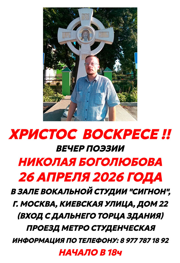ОБЪЯВЛЕНИЕ. Москва. 26 апреля. Вечер поэзии Николая Боголюбова.![]() ЖИВОНОСНОМУ ИСТОЧНИКУ МОЛЬБА! В чашу жизни сходит вдохновение, Бей чертей, гони из сердца вон! Сокровенный путь Боговселения – Исихáзм Божественных имëн. Буквы выступают знаменосцами, Скрыто пламя в солнечных мостáх! Земленóсцы станут Богоносцами, На своих распятые крестах. Праведная сила Православия Рвëт паденья сумрачную сеть, Дарит сердцу луч Богодержавия – Сквозь туман вещественный прозреть! Приглашаем всех на водосвятие, Вышиваем крестиком броню! Христианство – это про Распятие, А не про крысиную возню!! От купели – к высям Вознесения! Парус Духа нас несëт сквозь прах! Воля Спаса – Царство Воскресения, Молнии Отечества в стихах! 17.04.2026г. Празднование Живоносному Источнику Божией Матери. Николай Боголюбов