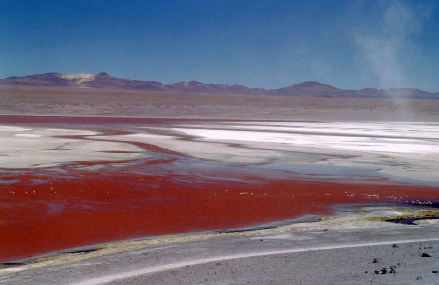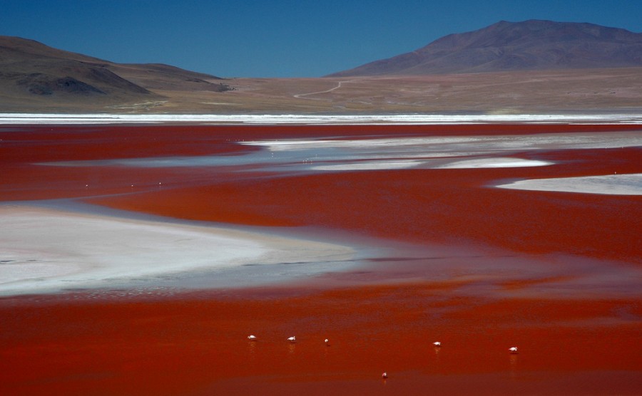 1. Лагуна Колорадо Цвет этого озера может меняться от кроваво-красного до фиолетового. Это зависит от времени суток и температуры воздуха. Необычный оттенок воды придают озеру водоросли, производящие каротин для защиты от ультрафиолетового излучения.