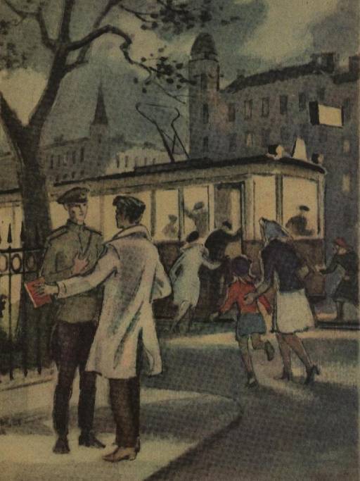 Я уже хотел несолоно хлебавши возвращаться в сад, как вдруг увидел — за углом, на трамвайной остановке — защитную командирскую фуражку с синим кавалерийским околышем. Кажется, еще никогда в жизни я так не радовался, как обрадовался в эту минуту. Сломя голову я побежал к остановке. И вдруг, не успел добежать, вижу — к остановке подходит трамвай, и командир, молодой кавалерийский майор, вместе с остальной публикой собирается протискиваться в вагон.