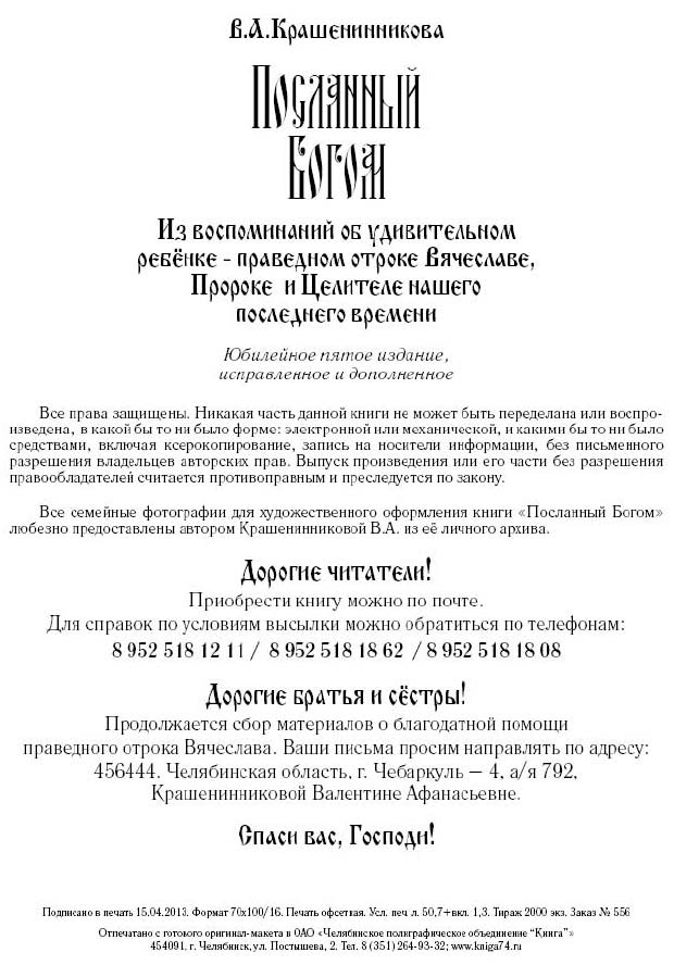 НОВАЯ РЕДАКЦИЯ КНИГИ "ПОСЛАННЫЙ БОГОМ" (отрок Вячеслав Крашенинников) - можно скачать